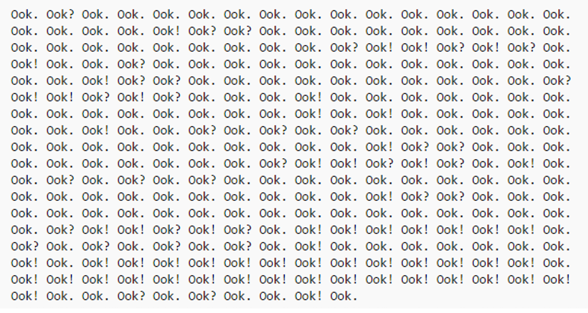 a programming language modeled on “Orangutan words” where every character is just the word “Ook” followed by a different punctuation mark.